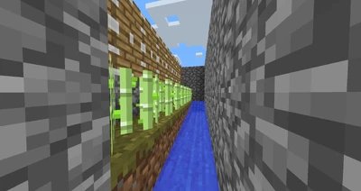 Найдите ровную площадку. Затем выстройте на ней блоки земли и травы в одну линию произвольной длины. Эта насыпь или бордюр будет служить местом для посадки тростника. Затем окружите её блоками булыжника, например, как показано на втором рисунке. Одну из канавок, которая образовалась между бордюром и стенкой из булыжника, залейте водой.