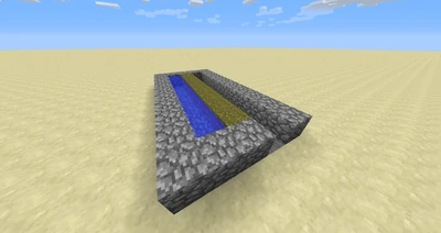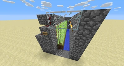 Затем закройте сверху воду двумя вертикальными рядами блоков булыжника и поднимите другие стенки на один блок. Далее расположите над только что установленным рядом булыжника над водой два вертикальных ряда поршней любого типа, но так, чтобы при активации сами поршни высовывались в сторону места для посадки тростника, то есть бордюра из грязи. (Меньше затрат составляет конструкция, состоящая из одного ряда поршней, так как при удалении нижнего блока тростника выпадают и верхние, также существует ошибка с возвращением верхнего ряда поршней)