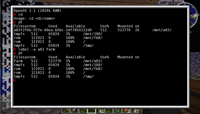 You may also notice that a few of the filesystems are mounted multiple times. The behavior of OpenOS is to automatically mount filesystems in the /mnt directory, with the first 3 or more unique letters of its address as the directory name. Some components get a special mount location, such as the filesystem that booted the system. In this case, the floppy disk on /mnt/bc3/ is the boot filesystem, and thus is the rootfs (on /). To help make the listing more readable, sorts the listing by address.